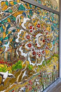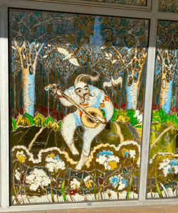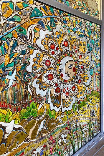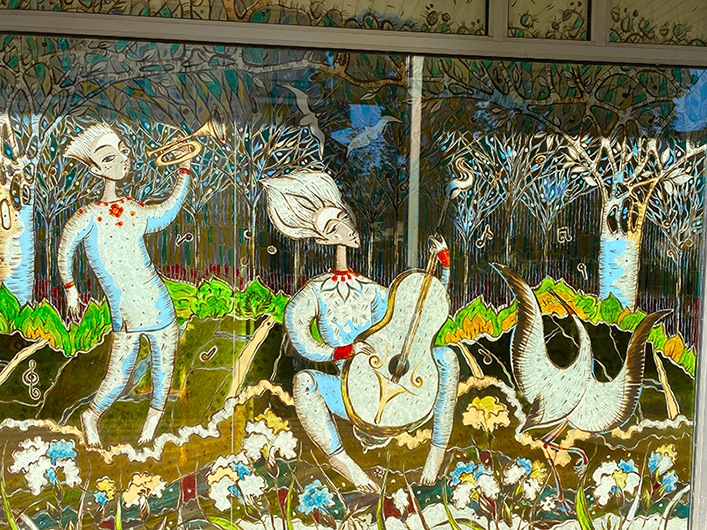 Pour la fresque de l’espace Paul Valéry, j’ai voulu capturer le jeu de la lumière du soleil à travers le verre, la projection des ombres et les couleurs transparentes des vitraux. Pour cette œuvre, je me suis inspirée des “vytinanka”, des motifs ukrainiens découpés dans le papier, et je les ai mélangés à la lueur froide du vitrail, à une touche de gothique et à la musique de la vie. Pour moi, lorsque le soleil brille, nous l’entendons dans nos cœurs, comme le tintement lointain de cloches lumineuses.
