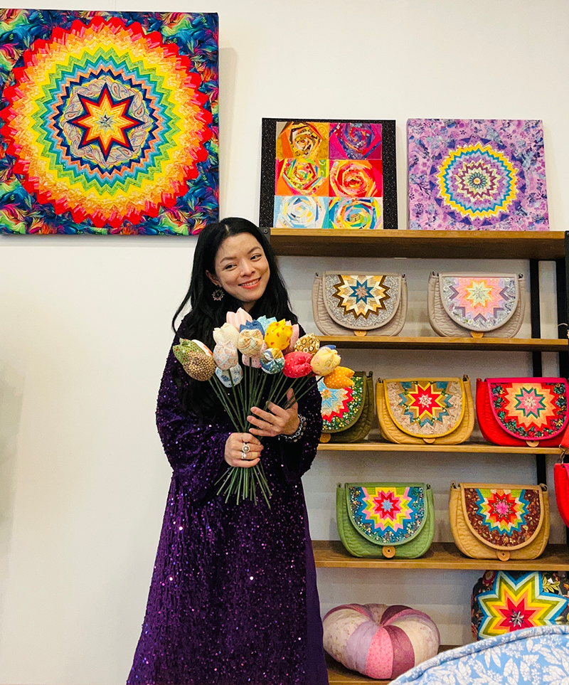 Anh Hoang Nguyet a commencé à se passionner pour le Patchwork en 2013, grâce aux techniques de broderie apprises en école de mode et à un stage de six mois en broderie haute couture à l’École Lessage de Paris en 2016. « Jusqu’à présent, les compétences que j’ai acquises m’ont beaucoup aidée dans la création de matériaux texturés. » Plesséenne depuis 20 ans, présente ses créations à la MJC du 1er au 28 février. Diplômée en modélisme et en artisanat d’art, cette artiste et artisane explore la matière à travers des pièces uniques alliant peinture textile, broderie et appliqués. Son travail se distingue par une maîtrise du pliage de tissu, une technique qui donne du volume à ses tableaux patchwork en trois dimensions. Qu’il s’agisse de vêtements conçus pour le quotidien ou de sacs originaux faits main, chaque objet naît d’un mélange de coton et de lin, où le cercle occupe une place centrale. Inspirées par la nature et les couleurs vives, ses œuvres sont une expression de liberté. Pour Anh Hoang Nguyet, l’objectif est simple : offrir à travers ses tableaux une force de vie et d’espoir, à l’image d’une étoile dans le ciel.